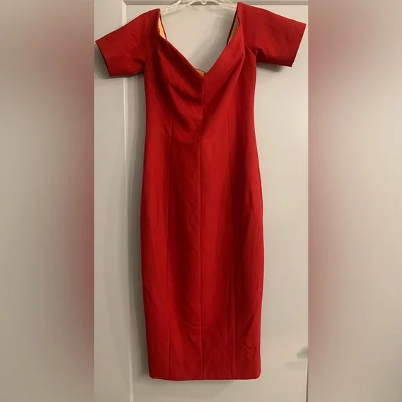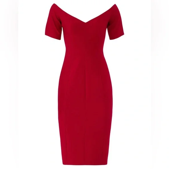 Brand new Cinq à Sept Crimson Birch Off the Shoulder Sheath Dress size 4Turn heads in this striking Cinq à Sept Crimson Birch sheath dress. This elegant, off-the-shoulder dress in a vibrant crimson red features a sleek, tailored fit that beautifully flatters the figure.A dramatic sweetheart neckline bares the shoulders, showing off a universally flattering part of the body in this svelte red dress tailored with waist-skimming princess seams. Perfect for formal events, weddings, or special evenings out, this sheath dress combines classic elegance with a bold pop of color. The comfortable fabric blend offers a hint of stretch for a perfect fit.Details:SheathShort sleeves V-necklineHidden back zipper closureFully linedMaterial: Red crepe (54% Polyester, 39% Viscose, 7% Elastane)Lining: 95% Polyester, 5% SpandexProfessional Dry Clean OnlyNo flaws. Please see pictures for measurements.Questions? Leave a comment below! Always open to reasonable offers!