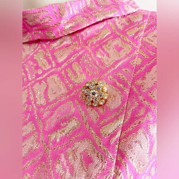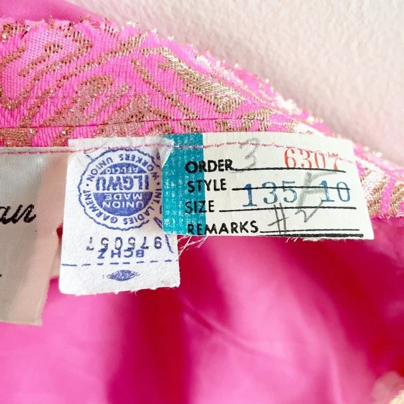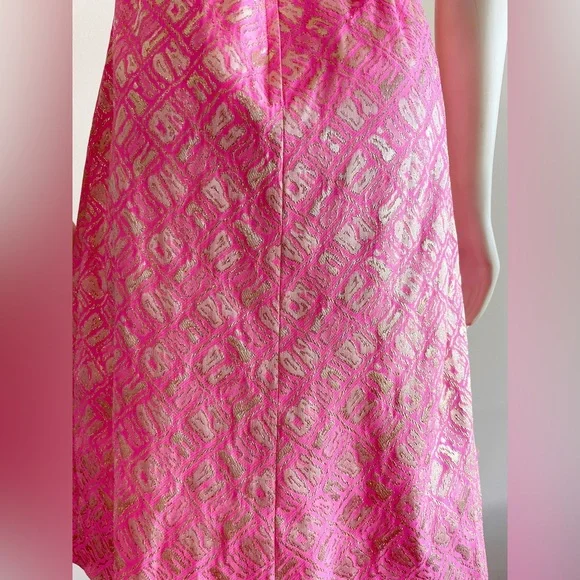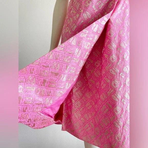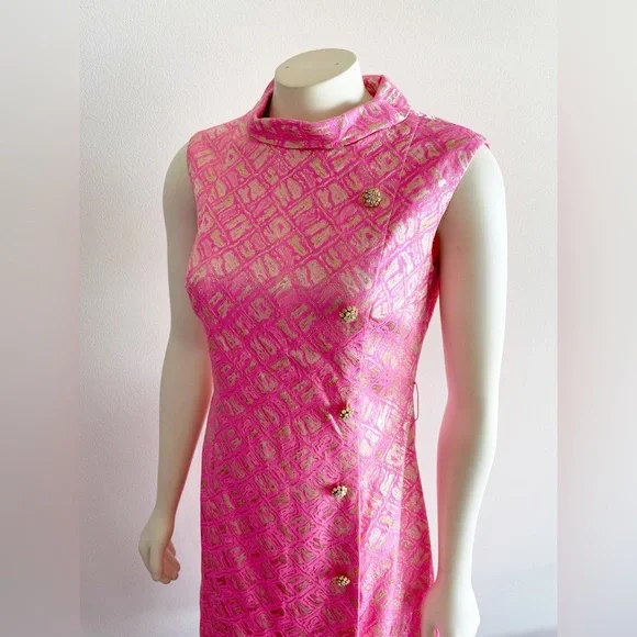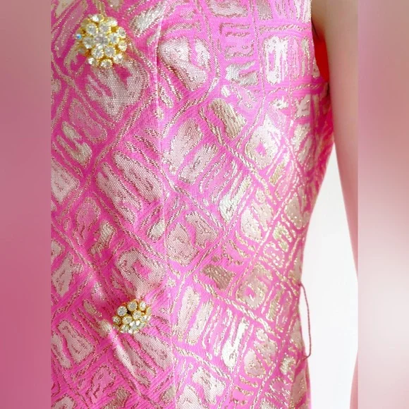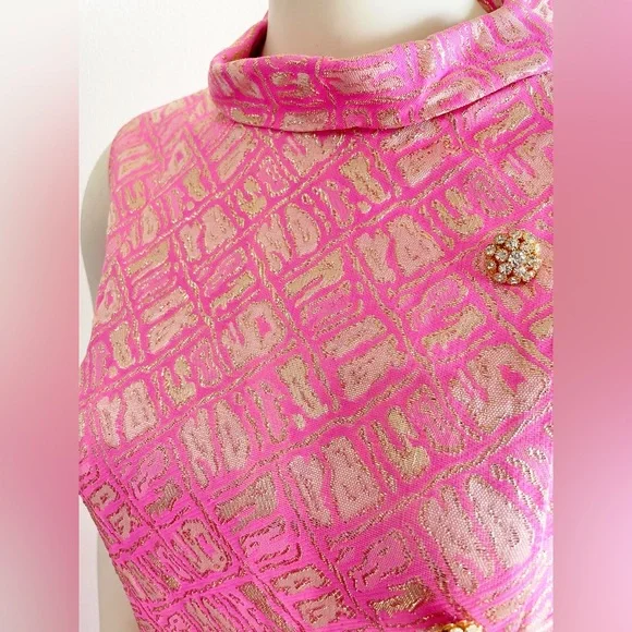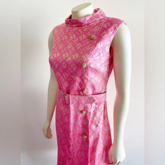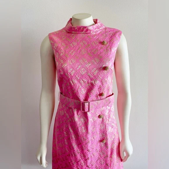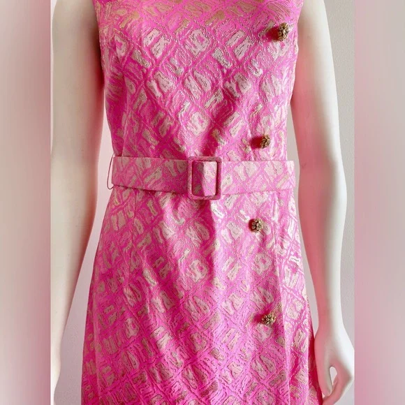 Richard Kaplan 1960s Pink Gold Metallic Thread Belted Vintage Shift Dress Sz 10Vintage 1960s Barbie! Such a beautiful well made and still in great shape dress! Excellent vintage condition Collared, sleeveless, back zipper closure, belted, high neck, crystal sparkly buttons all in excellent shape.Belt has minor pull away but not noticed when worn.Union madeSize 10Rare and one of a kind!Measurements are approximate and taken flat lay 16" pit to pit 15" waist 19" hip40" length