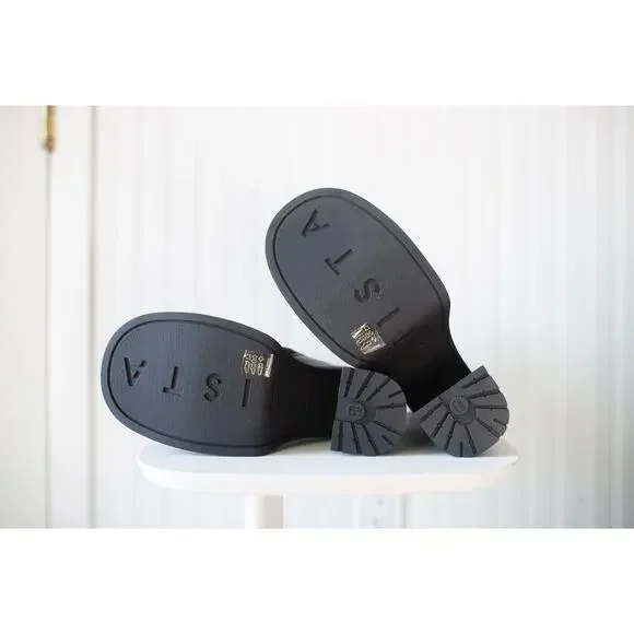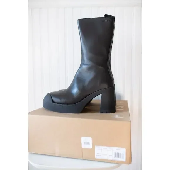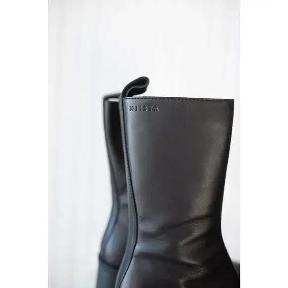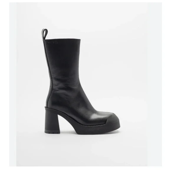 New with the boxSize EU 39A rubber toe cap gives these platform heeled boots from Miista the perfect head-turning touch.Features: Tall style, leather uppers, round toe, rubber toe cap, platform sole, chunky block heel, inner ankle zipper, pull tabsWhy We <3 It: A modern take on a classic retro silhouette.What’s Care FP? This product was consciously made to reduce our footprint and supports our mission to be a little bit better every day.Care/ImportMade in PortugalContentsLeather, Rubber